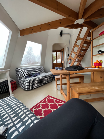 The little lighthouse cottage was just the cutest from the outside, and it didn't stop there. A two-storey white lighthouse shape, it had bright red trim and lots of windows, making this tiny home love at first sight. Wooden doors, window trim, and staircase inside were beautiful accents to fresh white walls, that lead you to the beautiful view outside all the glass windows. Two love seats on the main floor turned into beds come night. In the center of main floor a wooden table pulled down from the wall, and the coffee table turned to two bench seats (enough room for four). A functional three-piece bath tucked in under the stairs (you heard right, hot shower included!). The stairway/ladder was easy to climb and lead to the loft, which had a comfy queen bed, and a bit of room to store your belongings. The ceiling up there was high, with a hanging fan. The hexagon windows all opened up to let in a cool breeze and were fully screened. A stocked kitchen on the main floor had dishes and cookware, a fridge, sink, and stove top. My favoutie part of the kitchen was a large window that opened up and made you feel like you were outdoors, and gave a great cross breeze during the day. The natural light was bright, and at night there was a firepit with a nearby shed full of free wood (yes free!). If you're not in the mood for a fire, you can sit on the large wrap around deck!
